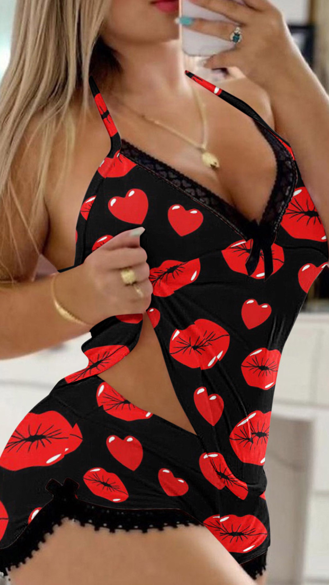 Sexy Lace Spliced Printed Two-piece Pajamas Set