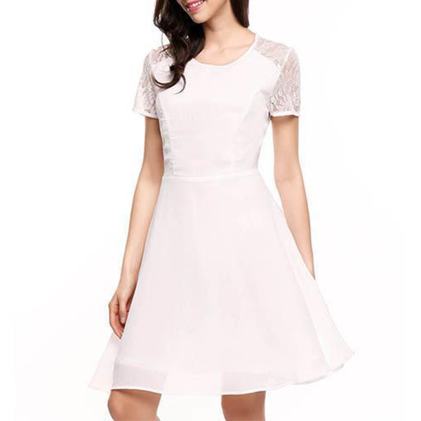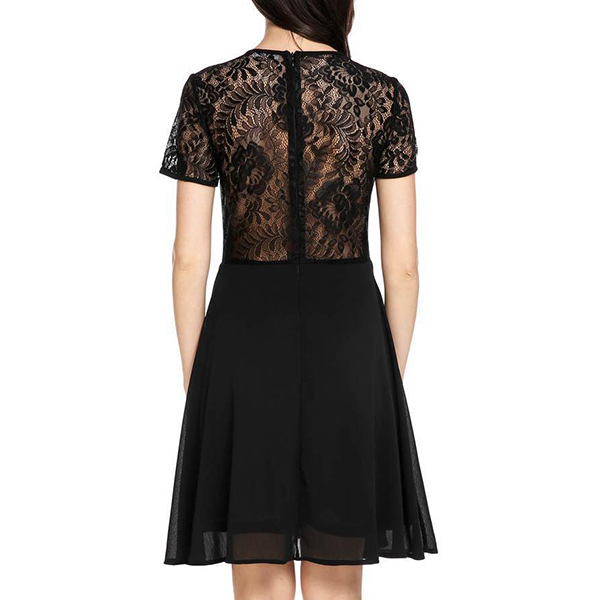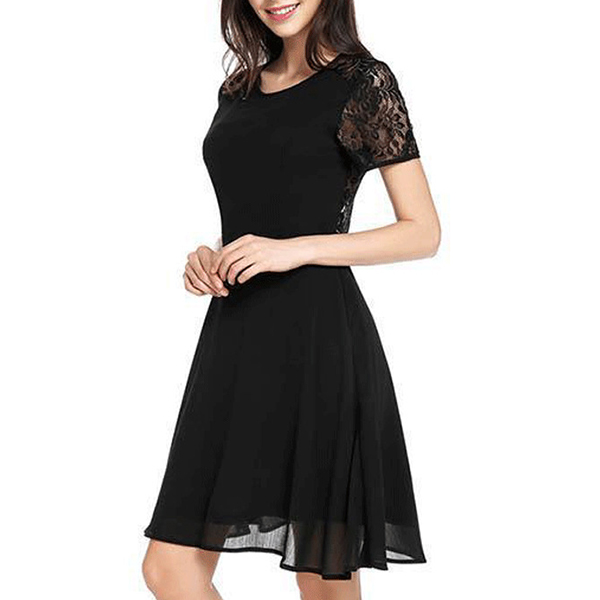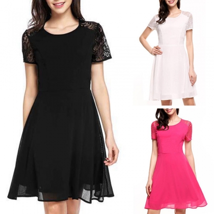 Sexy Lace Spliced Short Sleeve Round Neck Solid Color Dress