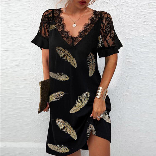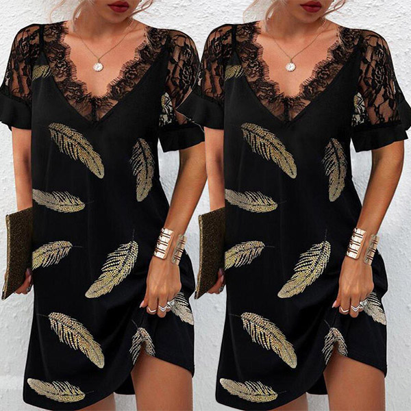 Sexy Lace Spliced Short Sleeve V-neck Feather Printed Summer Dress
