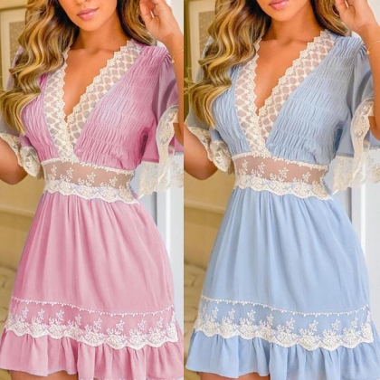 Sexy Lace Spliced Short Sleeve V-neck High Waist Dress