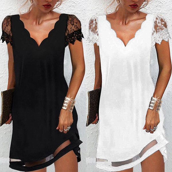 Crafted from soft and breathable fabric,with a loose silhouette,this dress can offer you a comfortable day. Meanwhile,the lace spliced short sleeve and v-neck design can enhance your feminine appeal. For your summer days,this dress that combines of sassy and flirty vibes is worth to arouse your attention.