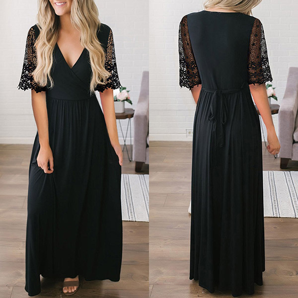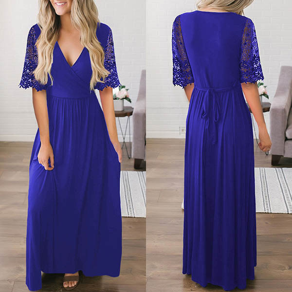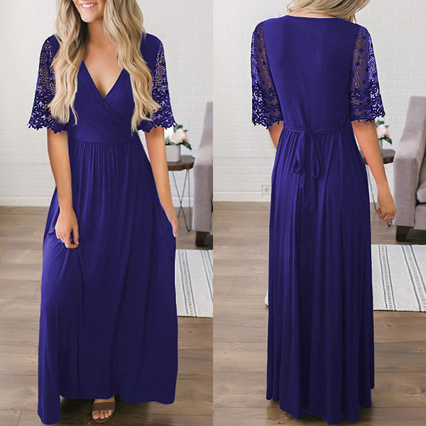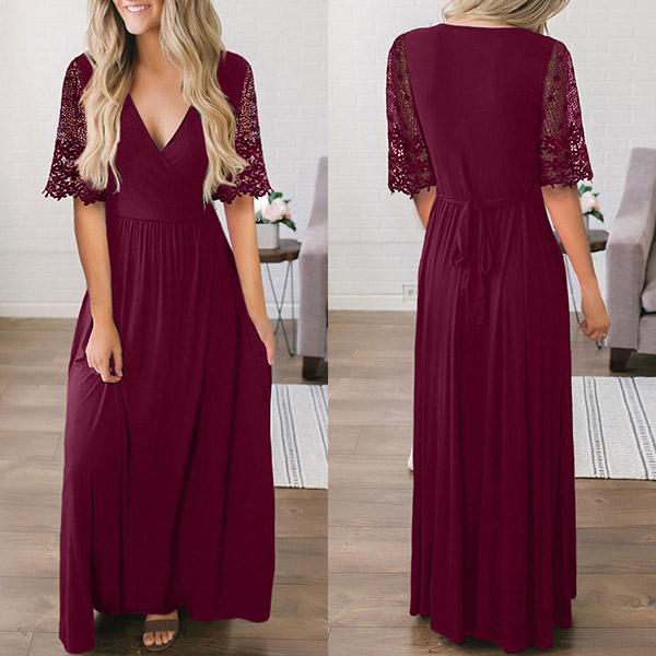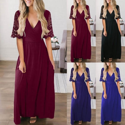 A cool way to incorporate comfort into your everyday look as well as maintain your style is by adding this dress to your ensemble. Solid color style,the v-neck and lace spliced short sleeve design will exude your feminine side,while the high waist and maxi length design can showcase your slender figure. Simply need to match with your favourite heels,then you can look beautiful enough!