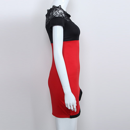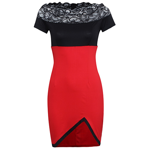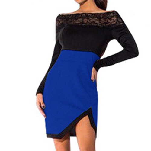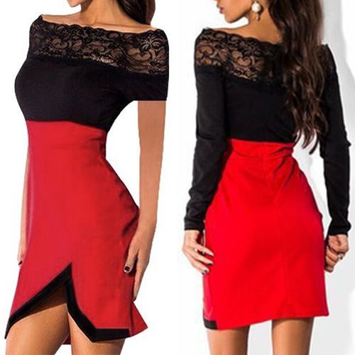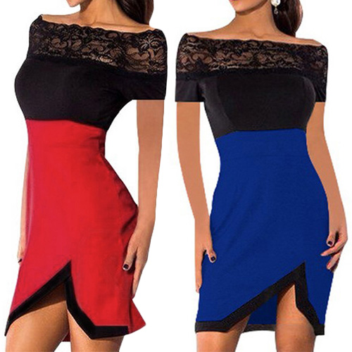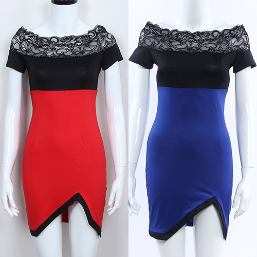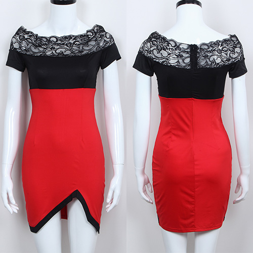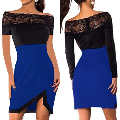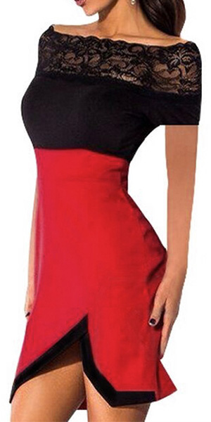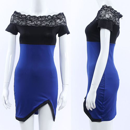 Its stunning details such as lace spliced slash neck,irregular hem and fit silhouette make this dress