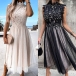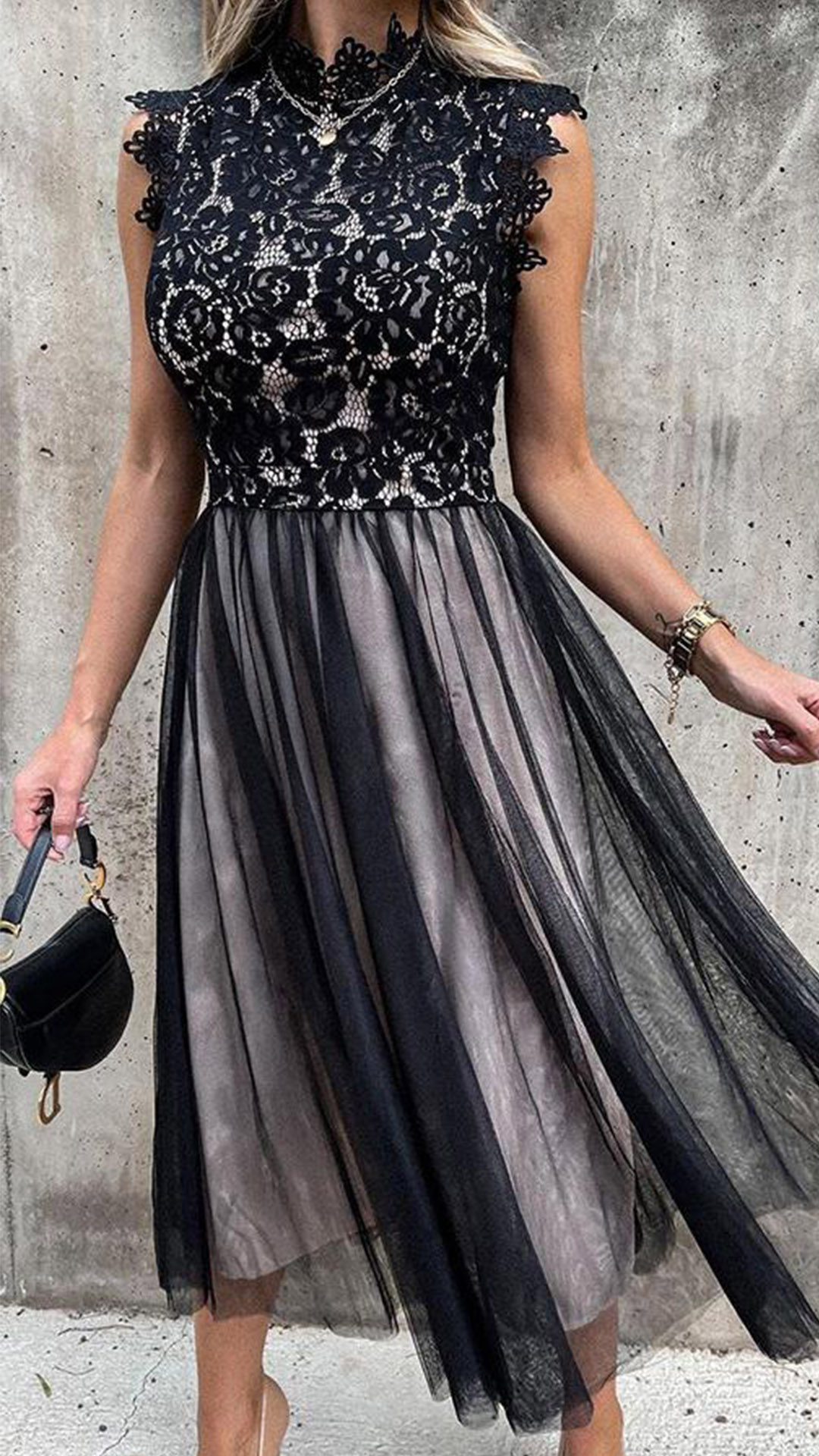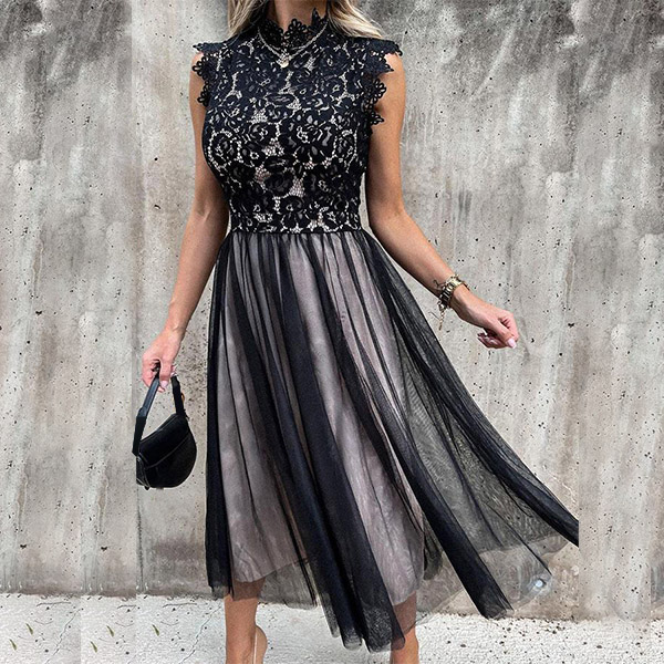 Sexy Lace Spliced Sleeveless Mock Neck High Waist Dress