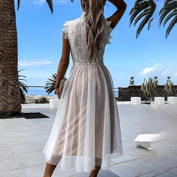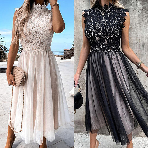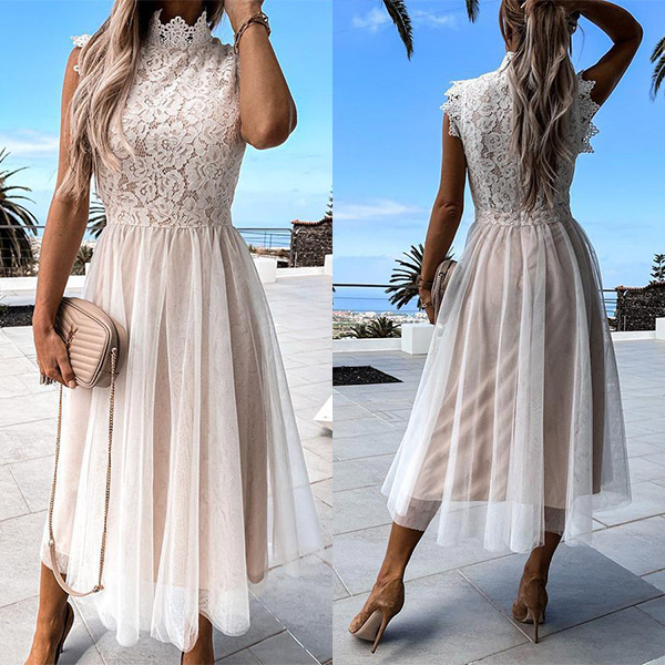 You look so sexy and flirty when you dress yourself up with this dress. Finished with sleeveless,mock neck and high waist design,this dress can showcase your slender figure. Moreover,the lace spliced details will enhance its entire charm. For your fancy events,you can trust in this dress to express your beauty and charm.