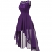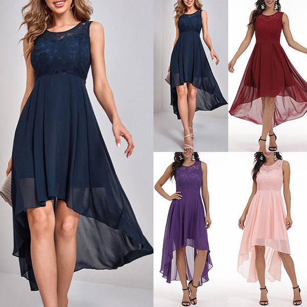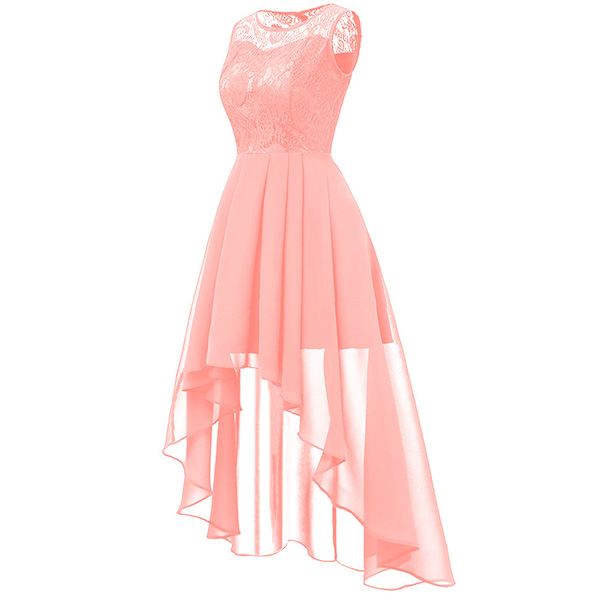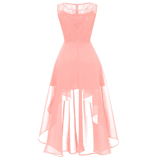 Combines of lace and chiffon element,this dress can easily arouse your attention. The high-low hem design makes this piece look more stylish and attractive. Finished with sleeveless,round neck and high waist design,this dress not only can showcase your slender figure,but also exude your feminine side and alluring sense.