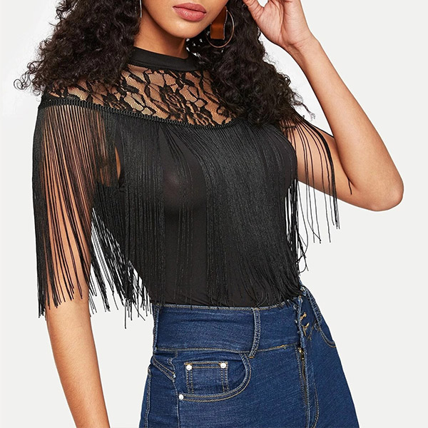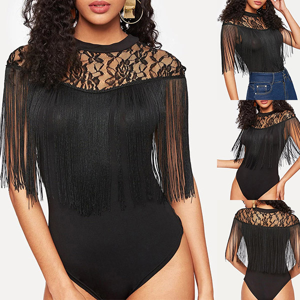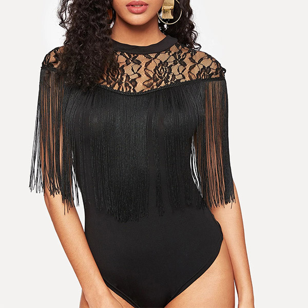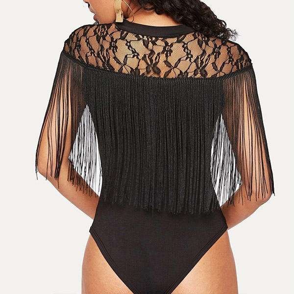 It is a good chance to flaunt off your perfect figure and exude your charming feminine appeal with this bodysuit. The lace spliced details and tassel design make this piece look so distinctive and alluring. Try to match with your high waist pants to achieve for a stunning look!