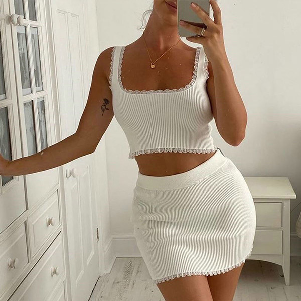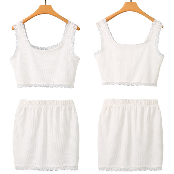 Sexy Lace Spliced Sleeveless Square Collar Crop Top + Skirt Two-piece Set