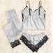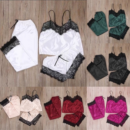 Sexy Lace Spliced Sling Top + Shorts + Pants Nightwear Three-piece Set