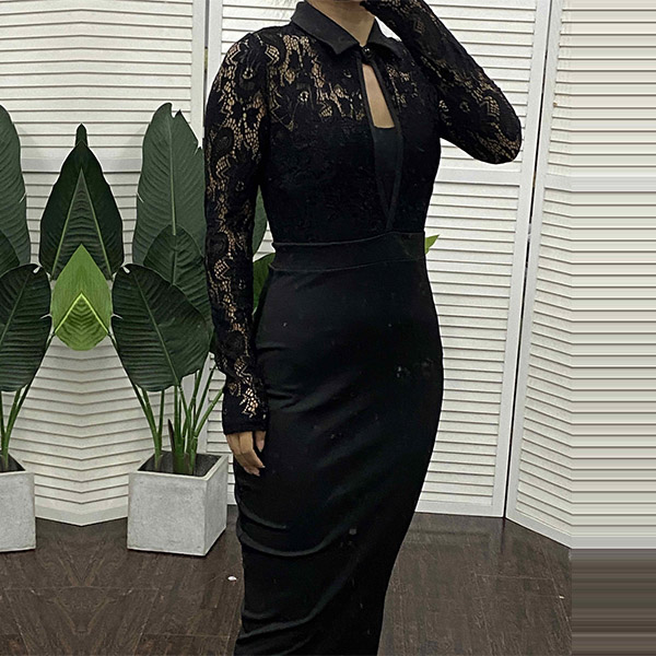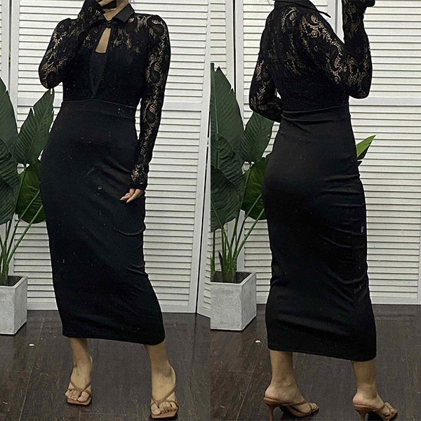 This Sexy Lace Spliced Stand Collar Long Sleeve Bodycon Dress is the perfect way to show off your curves! Its alluring lace splicing bodice features a stand collar and front cutout design which adds an extra touch of sexiness, while its long sleeve and bodycon fit give you a sleek and sophisticated look. Whether you're going out for a night on the town or just looking to make a statement, this dress is sure to turn heads.