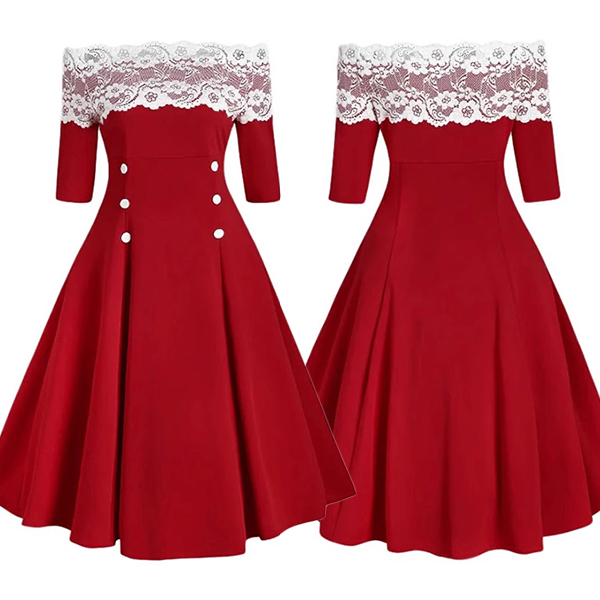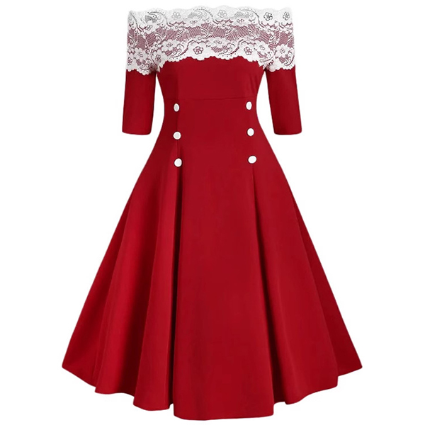 This dress features a strapless design with lace spliced detailing, double-breasted buttons, and pleated skirt, creating a chic and stylish piece that is perfect for special occasions or evening events.
