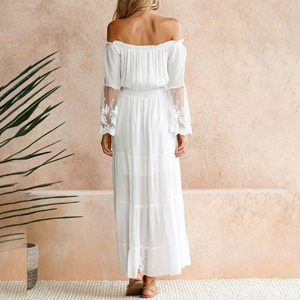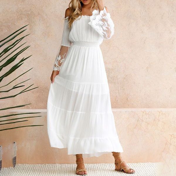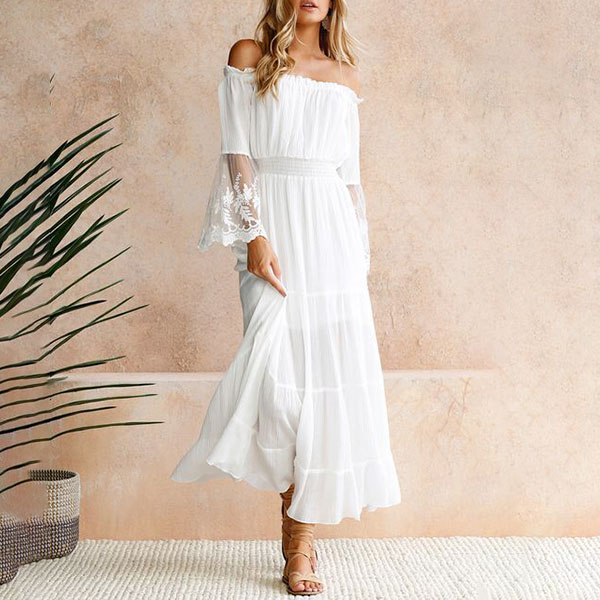 Your feminine appeal can have an instant boost when you dress yourself up with this beautiful dress. Solid color style,the boat neck and lace spliced trumpet sleeve design make this piece look so sexy and flirty. From your daytime out to night dating,this dress can give you a perfect transition.