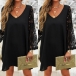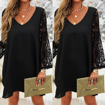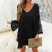 Sexy Lace Spliced Trumpet Sleeve V-neck Solid Color Loose Dress