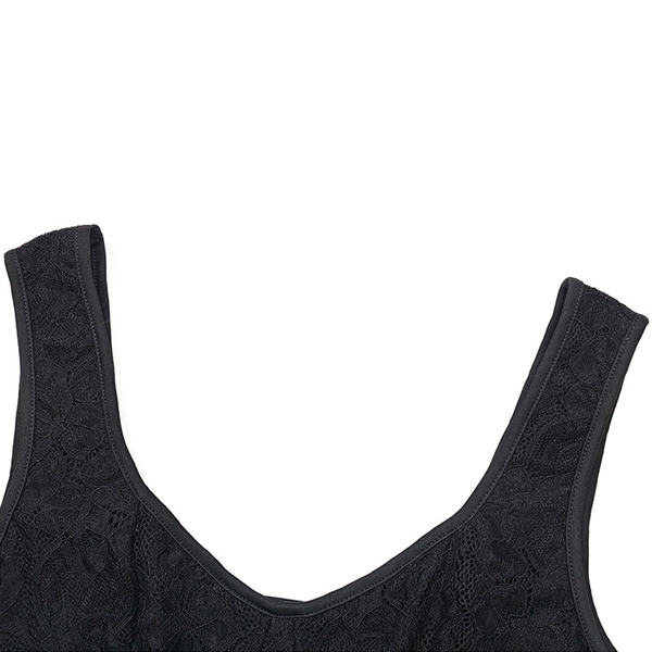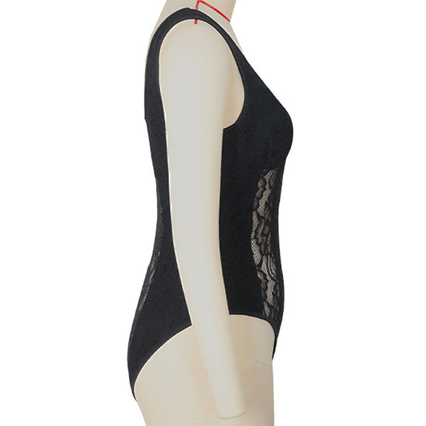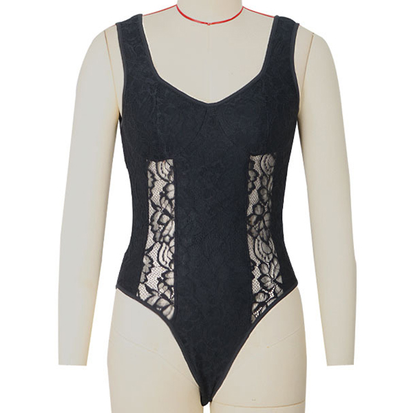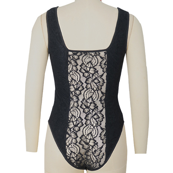 This black bodysuit features a captivating lace spliced design, a plunging V-neckline, and a figure-hugging silhouette. Pair it with high-waisted jeans or a skirt for a chic and contemporary outfit.