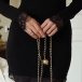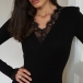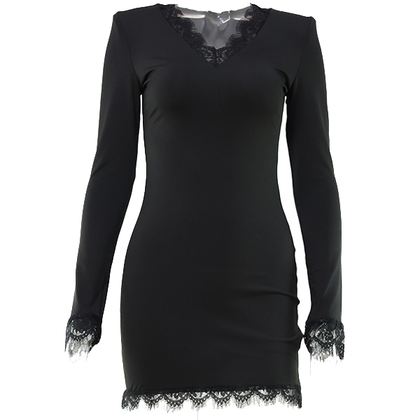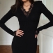 This black dress features delicate lace splicing along the V-neck, cuff and hemline, which adds depth and dimension to the sleek silhouette. Perfect for date nights, cocktail parties, romantic dinners, upscale events.