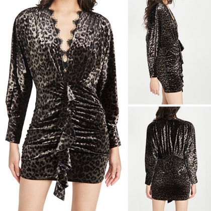 Sexy Lace Spliced V-neck Long Sleeve Slim Fit Leopard Printed Dress