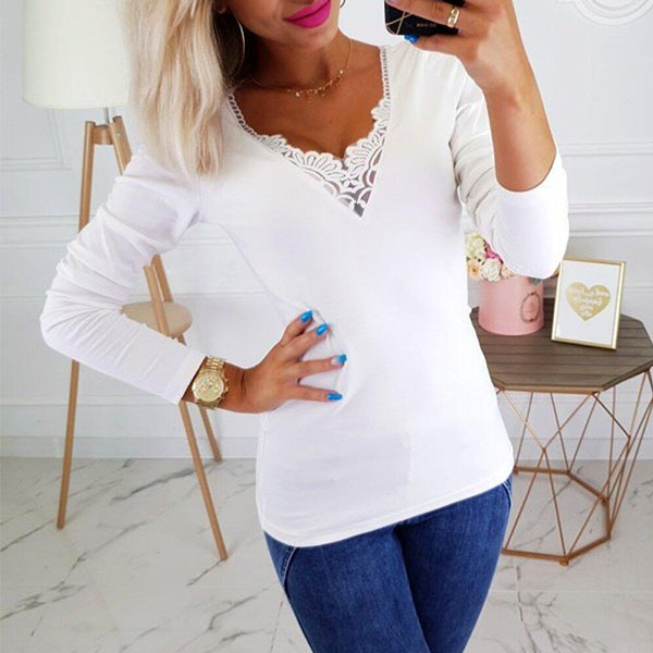Not only can give you a comfortable day,but also can exude your charming feminine appeal,that's why we suggest you this t-shirt. Comes with a solid color,with long sleeve and a fit silhouette design,this all-match t-shirt can offer you different matching styles. And the lace spliced v-neck design will offer you a sexier look.