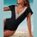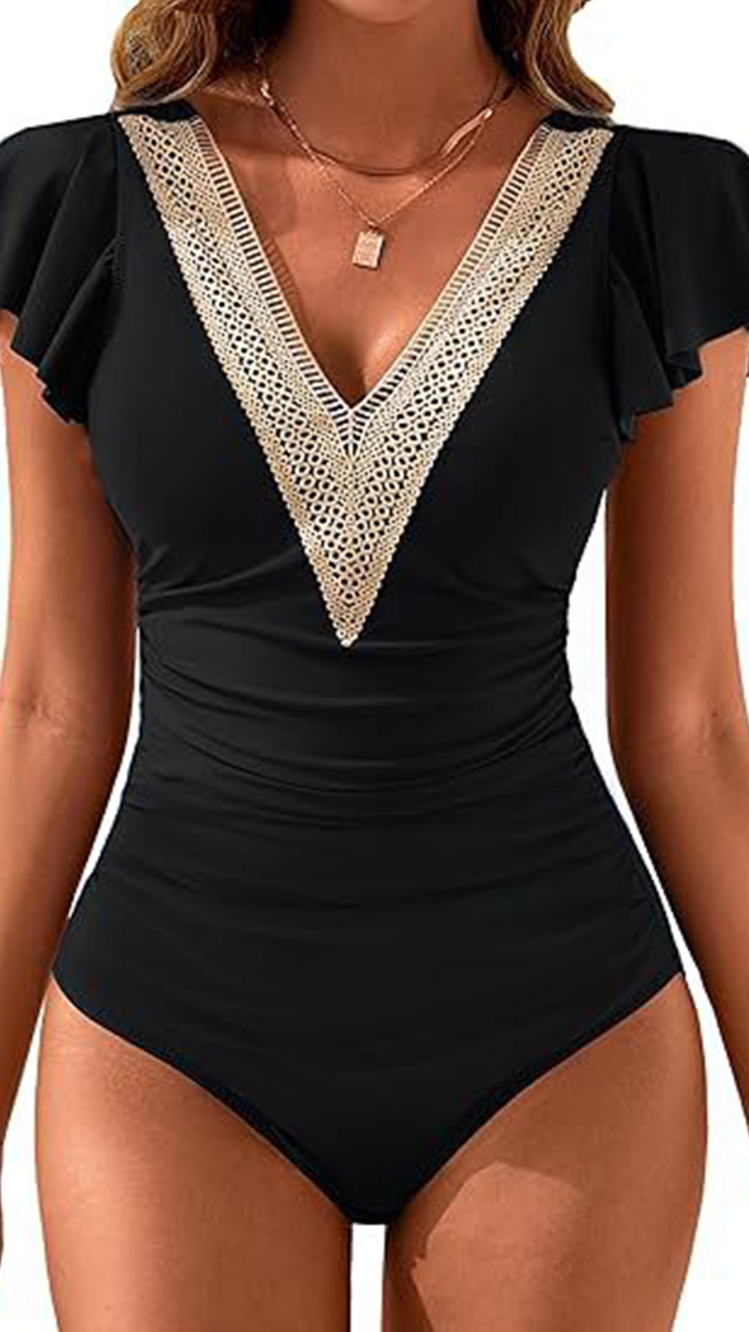 This swimsuit features a captivating combination of lace splicing along the V-neckline, ruffle detailing on the shoulder, and a backless silhouette. Wear it for a day at the beach, pool parties, or tropical vacations.