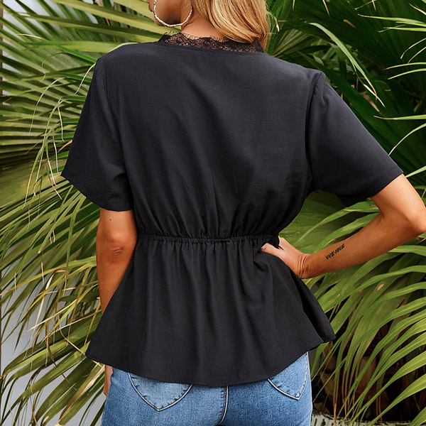 If you are ever in doubt as to what to wear on these hot summer days,you can always rely on this wonderful top. The lace spliced details and v-neck design will enhance your feminine appeal. Finished with short sleeve,an elastic waist and soft fabric,this piece is a good way to keep the comfy and style.