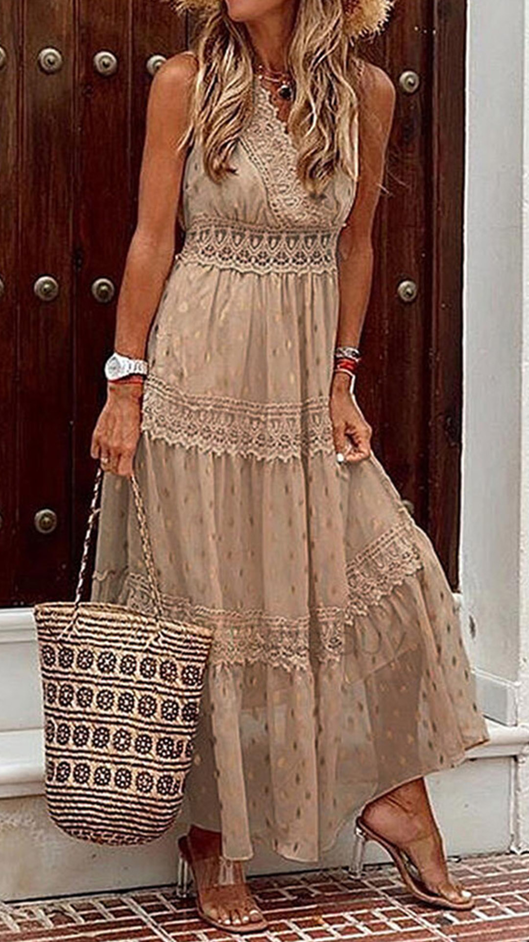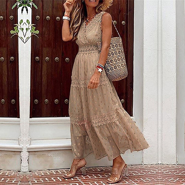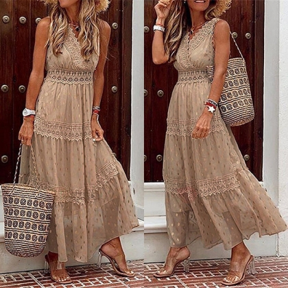 Enhance your feminine appeal on the weekends in the day time and transition to your date night with this dress. The lace spliced details can easily enhance your feminine appeal,while the high waist and maxi length design can showcase your slender figure. For your summer days,this sleeveless dress is worth to arouse your attention.