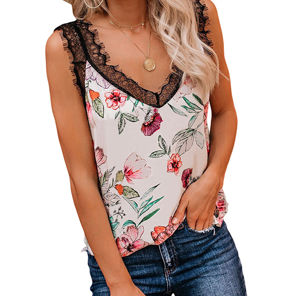 Sexy Lace Spliced V-neck Sleeveless Printed Loose Top