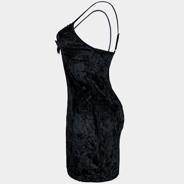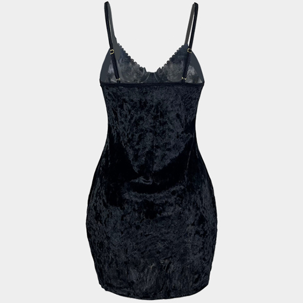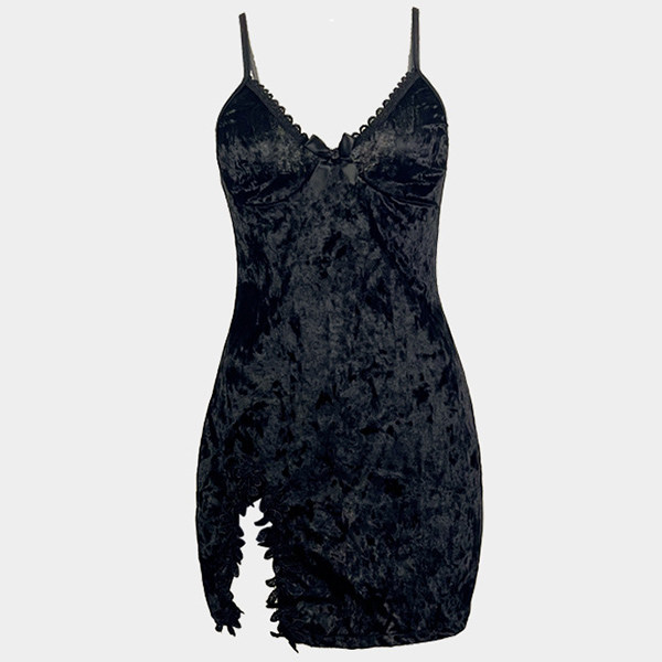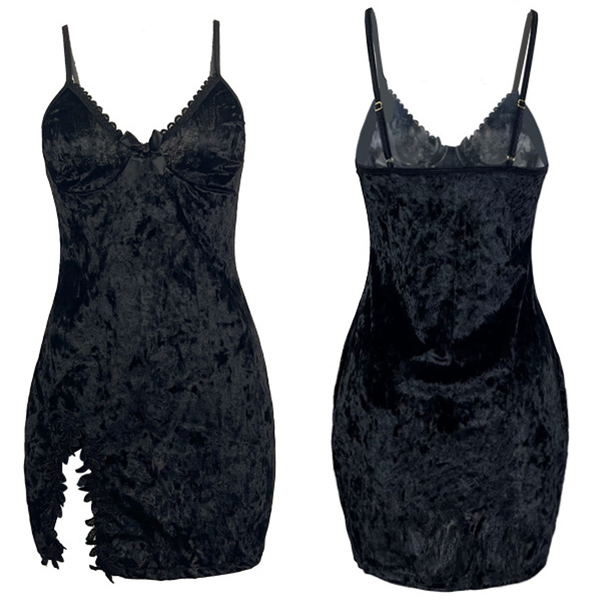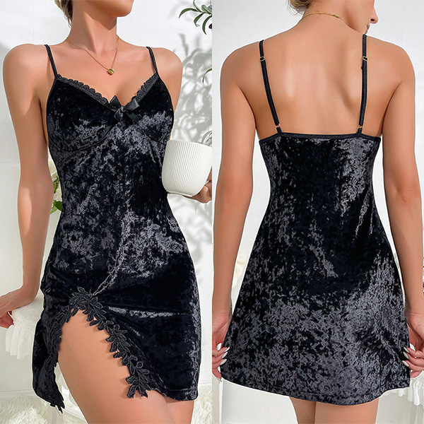 Sexy Lace Spliced V-neck Slit Velvet Slip Nightwear Dress