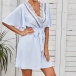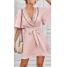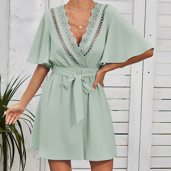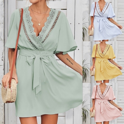 Sexy Lace Spliced V-neck Trumpet Sleeve High Waist Tie-belt Dress
