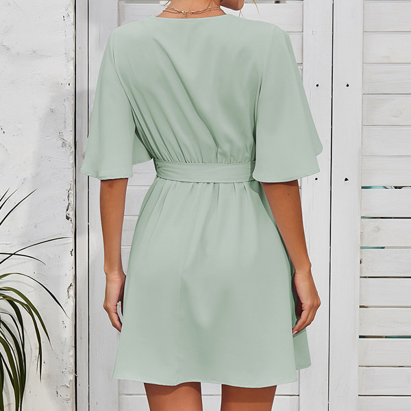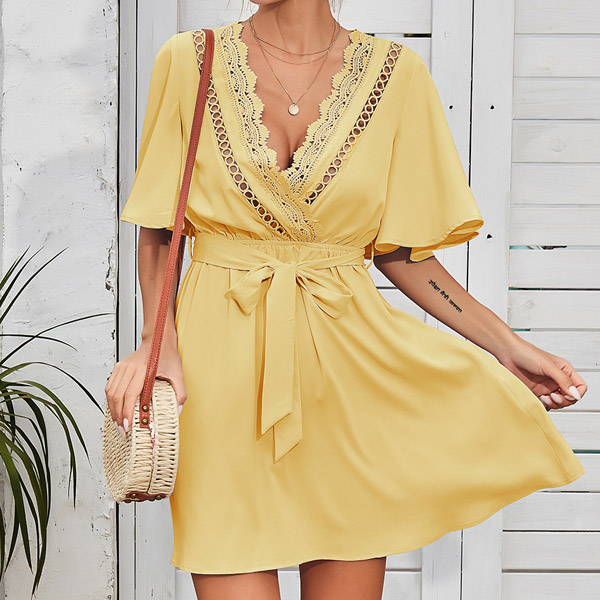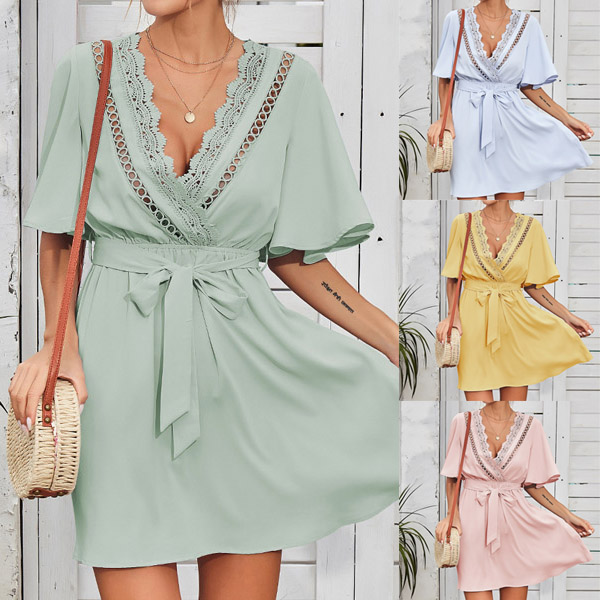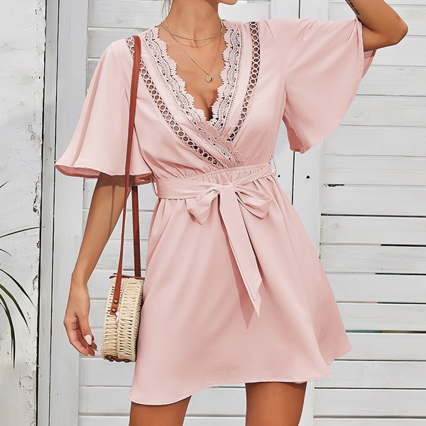 Look lively and full of personality with the exceptional style of this dress. It comes with a solid color,the trumpet sleeve and lace spliced v-neck design can exude your feminine side,while the high waist with tie-belt design can better showcase your waistline and figure. Just slip into this piece to start your wonderful day!
