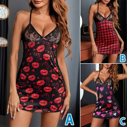 Sexy Lace Spliced with Heart Printed/Plaid Pattern Sling Nightwear Dress