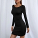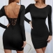 Sexy Lace-up Backless Long Sleeve Round Neck Solid Color Tight Dress