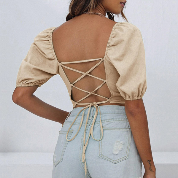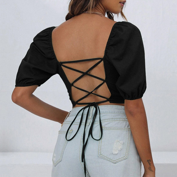 Sexy Lace-up Backless Short Sleeve Round Neck Solid Color T-shirt