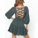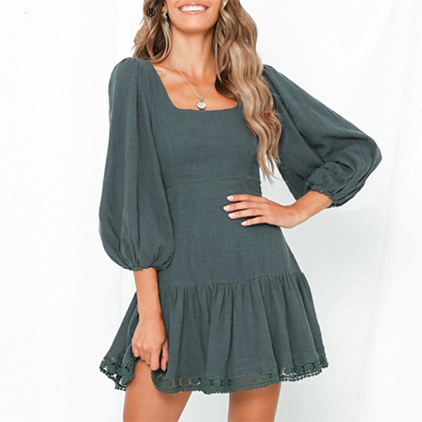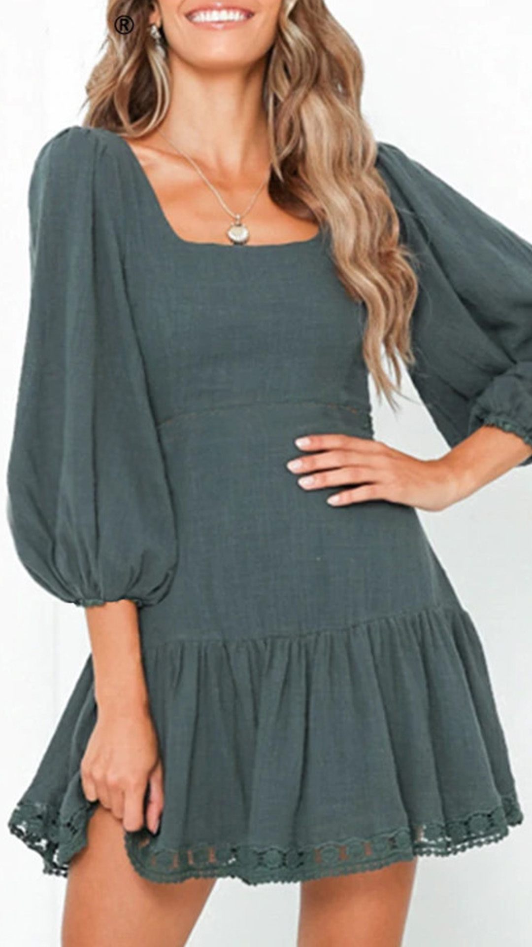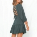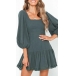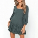 Sexy Lace-up Backless Square Collar Puff Sleeve Ruffle Hem Solid Color Dress