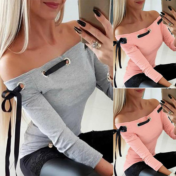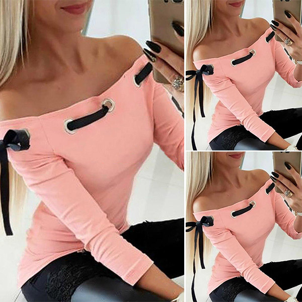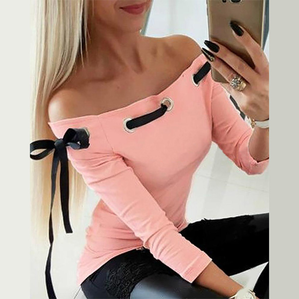 This t-shirt comes with a sweet pink tone,the boat neck and lace-up design will make this piece look sexy and flirty,while the fit silhouette design can showcase your perfect body-line. Try to match with a choker necklace for a more beautiful look.