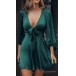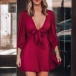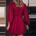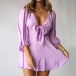 Sexy Lace-up Deep V-neck 3/4 Lantern Sleeve High Waist Solid Color Dress