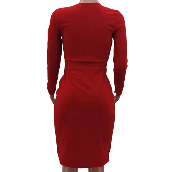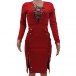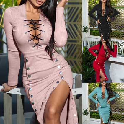 Sexy Lace-up Deep V-neck Button Slit Hem Long Sleeve Tight Dress
