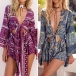 Sexy Lace-up Deep V-neck Trumpet Sleeve Printed Rompers