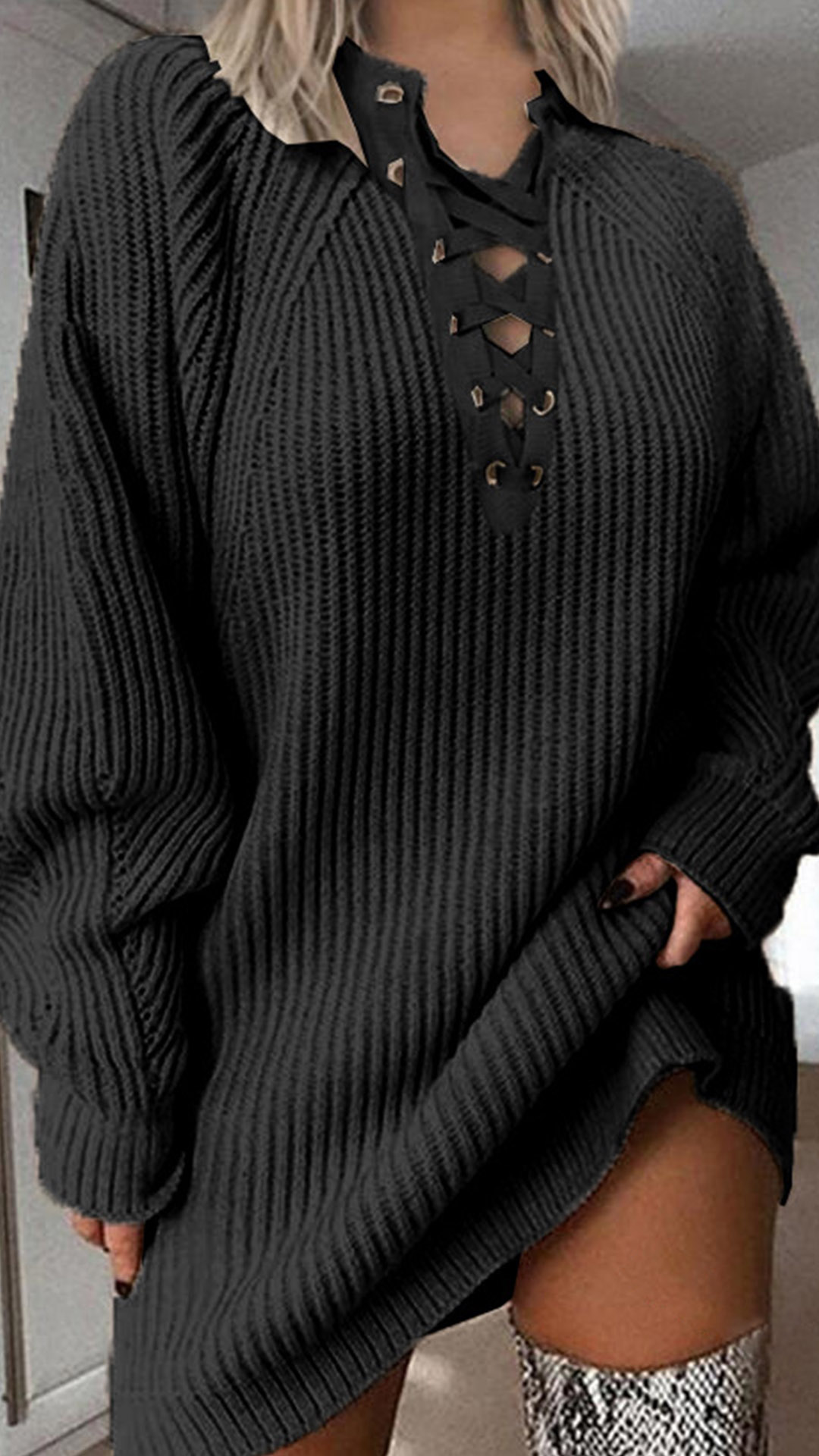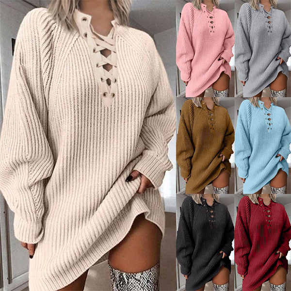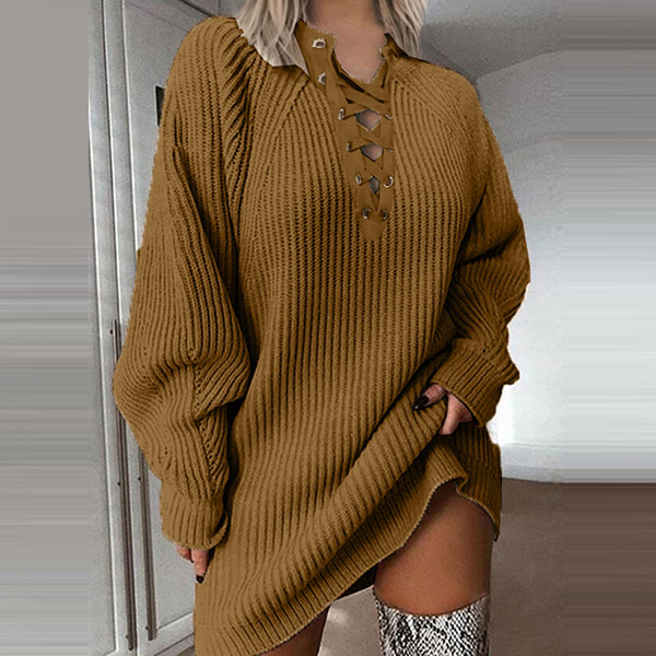 Get into the autumn mode with the help of this sweater dress. It boasts a solid color,the v-neck with lace-up design will lend you some sassy and flirty vibes. Crafted from soft and breathable knitted fabric,with long sleeve and a loose silhouette,this piece also can ensure the comfy and warmth. Matching with your over-the-knee boots would be a good idea.