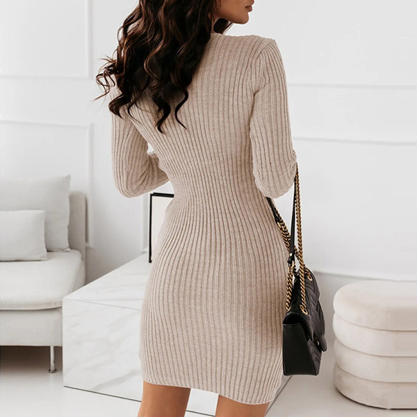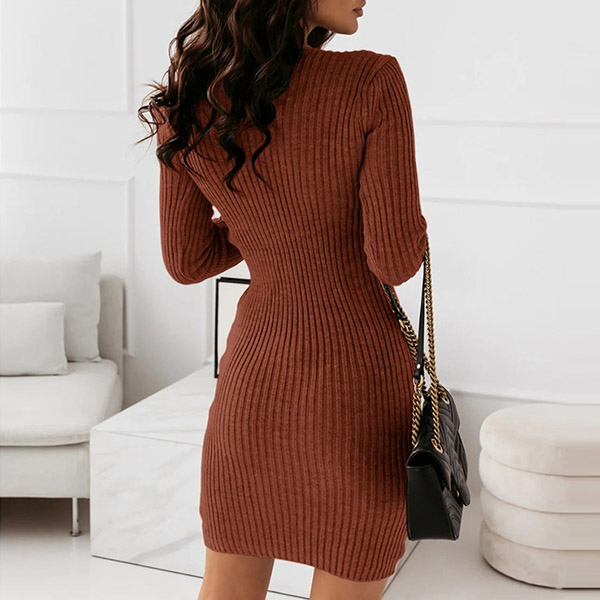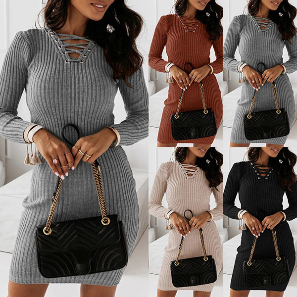Sexy Lace-up V-neck Long Sleeve Solid Color Slim Fit Knit Dress