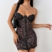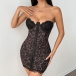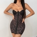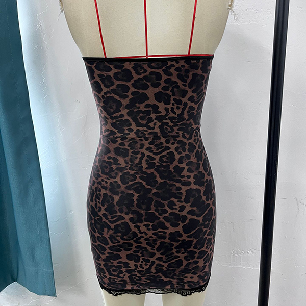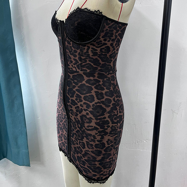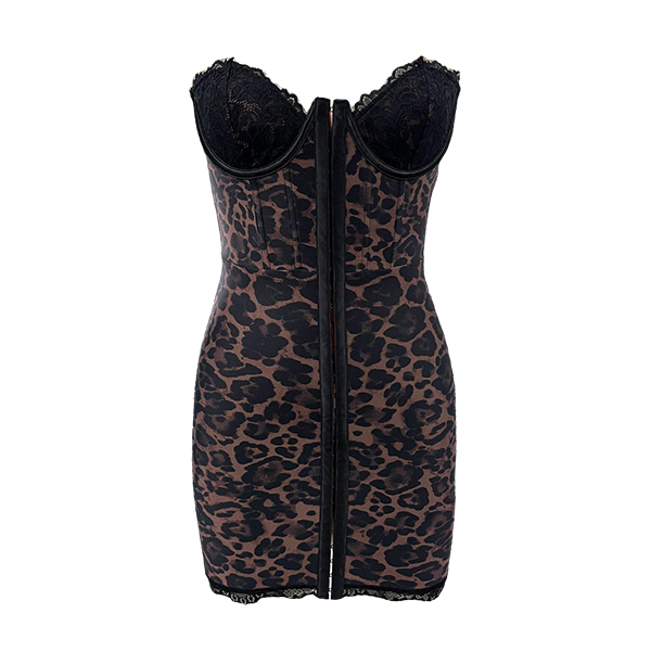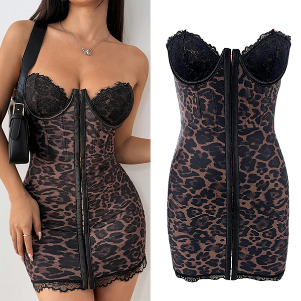 Sexy Leopard Print Strapless Front Buckle Lace Spliced Bodycon Dress