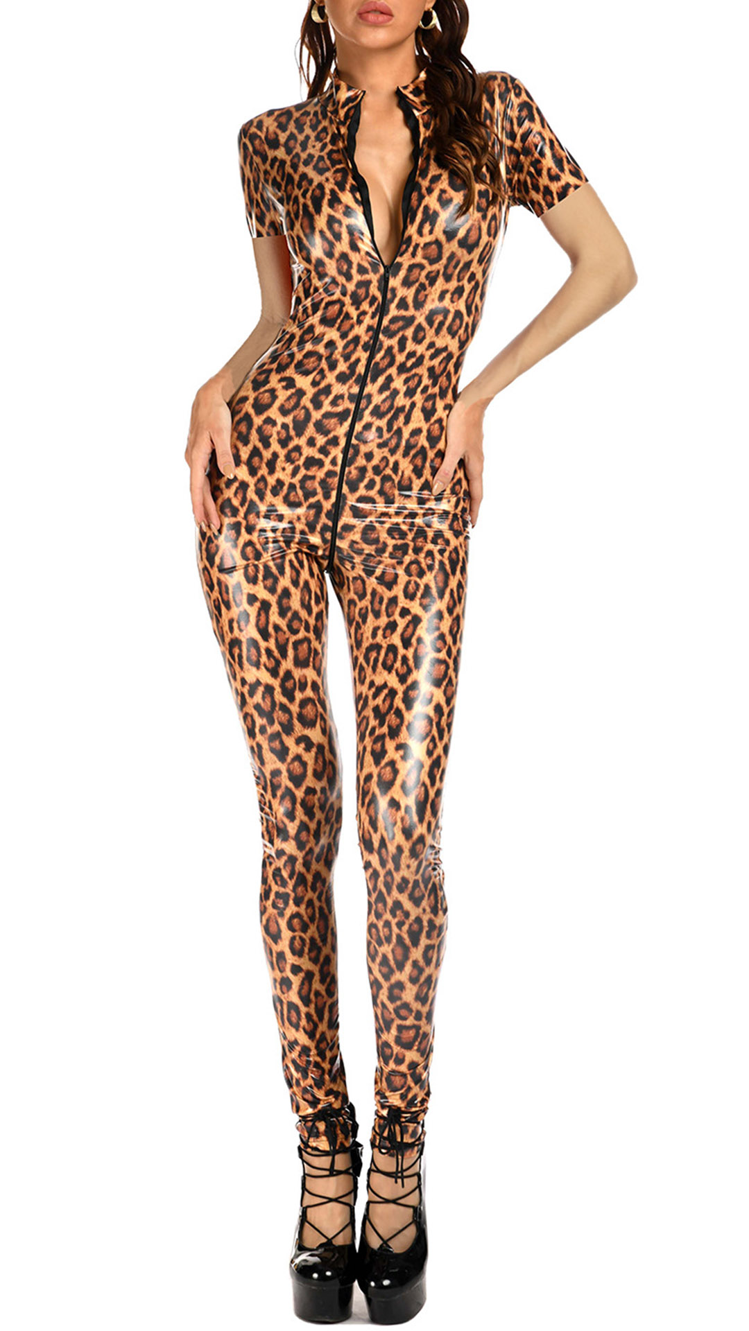 This women's jumpsuit features a sexy leopard print design and a zipper closure. So Hot!