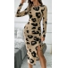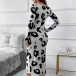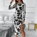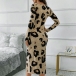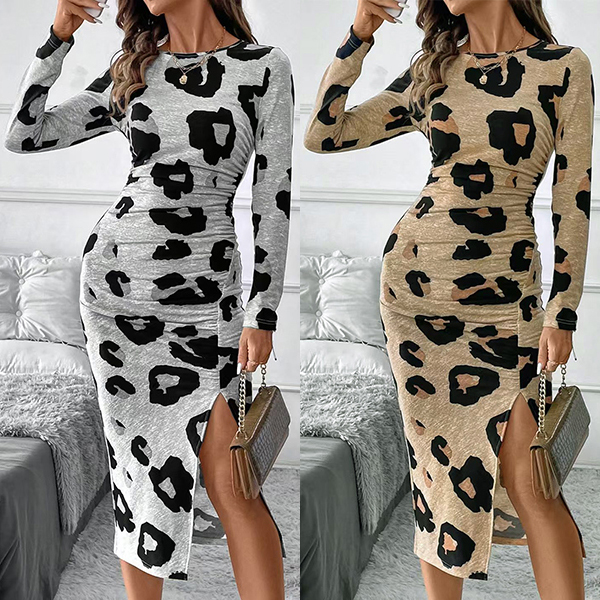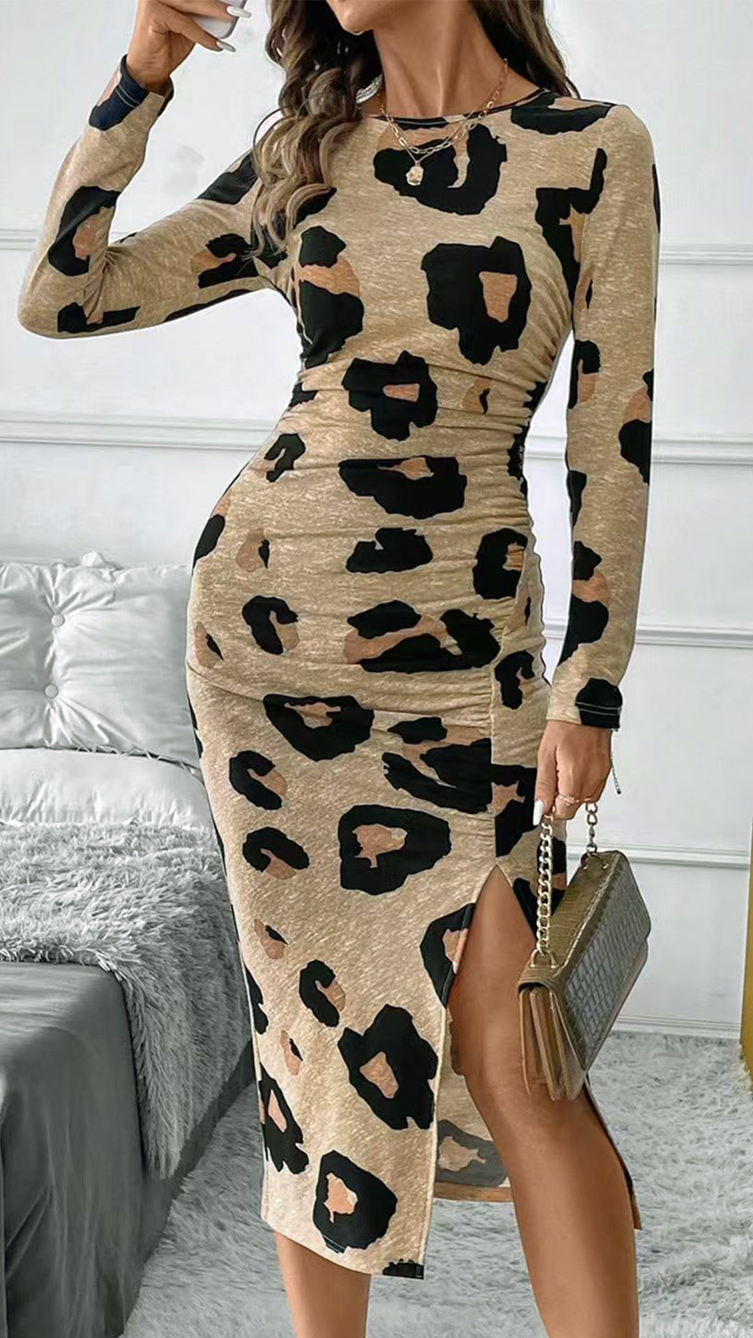 Sexy Leopard Printed Crew Neck Long Sleeve Side Slit Ruched Bodycon Dress