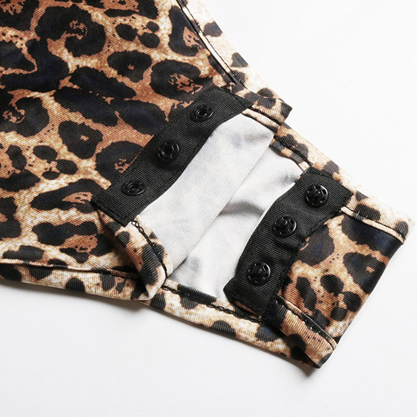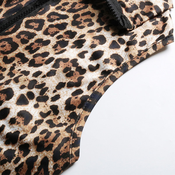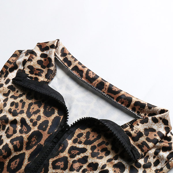 This bodysuit features a leopard print pattern, a half-zipper front, stand collar, and sleeveless design, creating a bold and stylish look. You could pair it with high-waisted pants or a skirt for a trendy and daring ensemble.