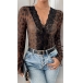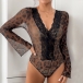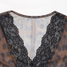 Sexy Leopard Printed Lace Spliced V-neck Long Sleeve Semi-through Gauze Bodysuit