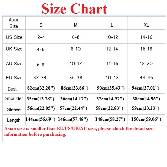 XL : Bust : 94cm(37.01"); Shoulder : 38cm(14.96"); Sleeve : 59cm(23.23"); Length : 150cm(59.06");
