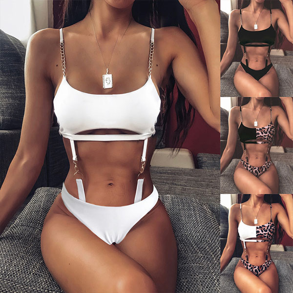 Attracted by this sexy and flirty bikini set? Then choose them as your perfect partner for your beach days. The leopard spliced details and chain design make it look so distinctive and alluring. When you wear them,you can easily be the focus.