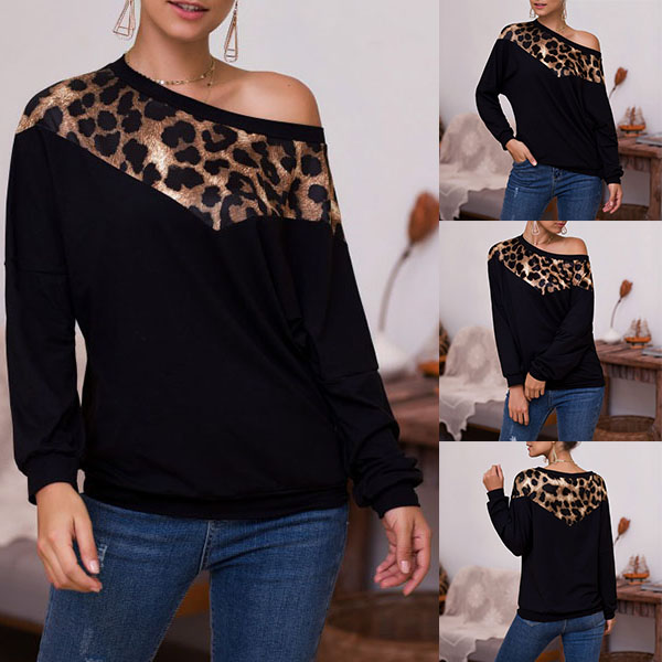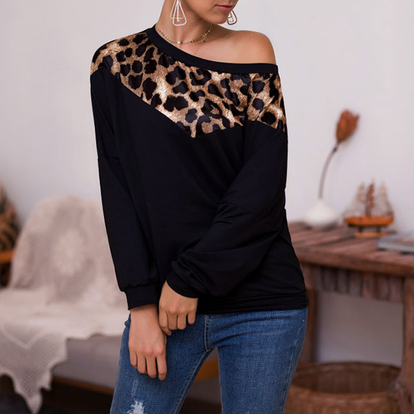 Sexy Leopard Spliced Oblique Shoulder Long Sleeve T-shirt