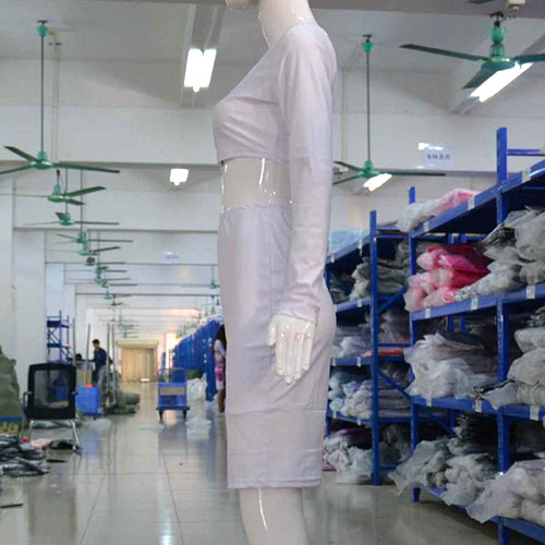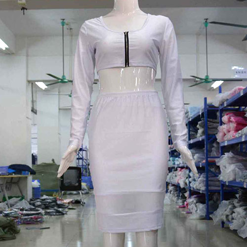 Consists of two parts. Tops with long sleeve and zipper style. Skirt with gauze spliced design.