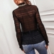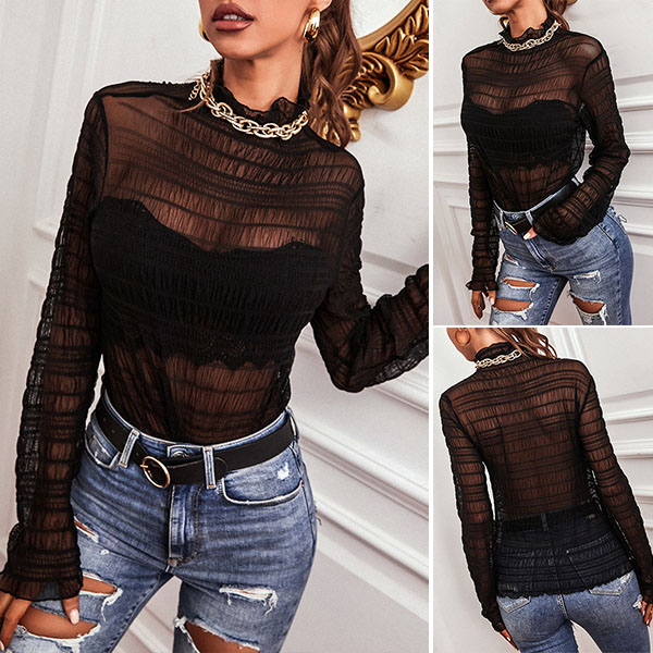 You have no need to wonder why all the eyes are focused on when you wear this top. See-through gauze style design make this piece look so sexy,flirty and alluring. Finished with long sleeve and mock neck design,this top can exude your charming feminine appeal.
