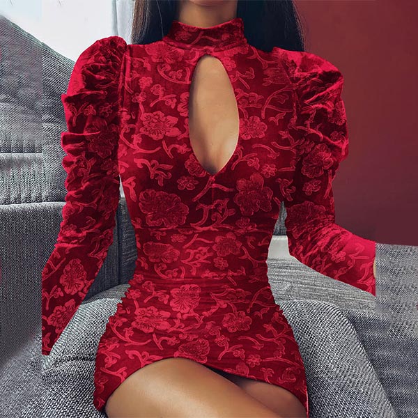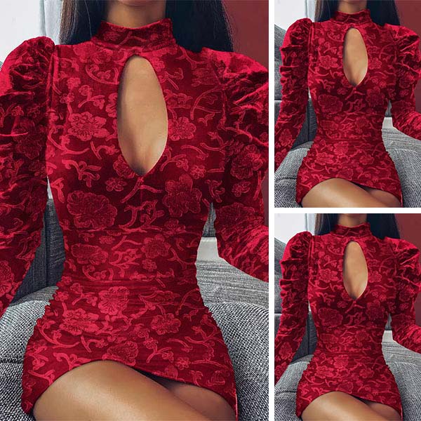 Sexy Long Sleeve Mock Neck Slim Fit Hollow Out Dress