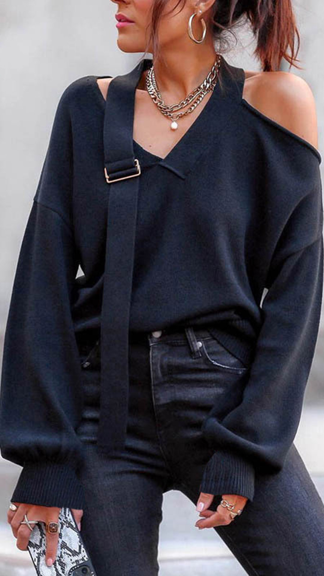 Sexy Long Sleeve Open Shoulder Halter Buckle Shirt